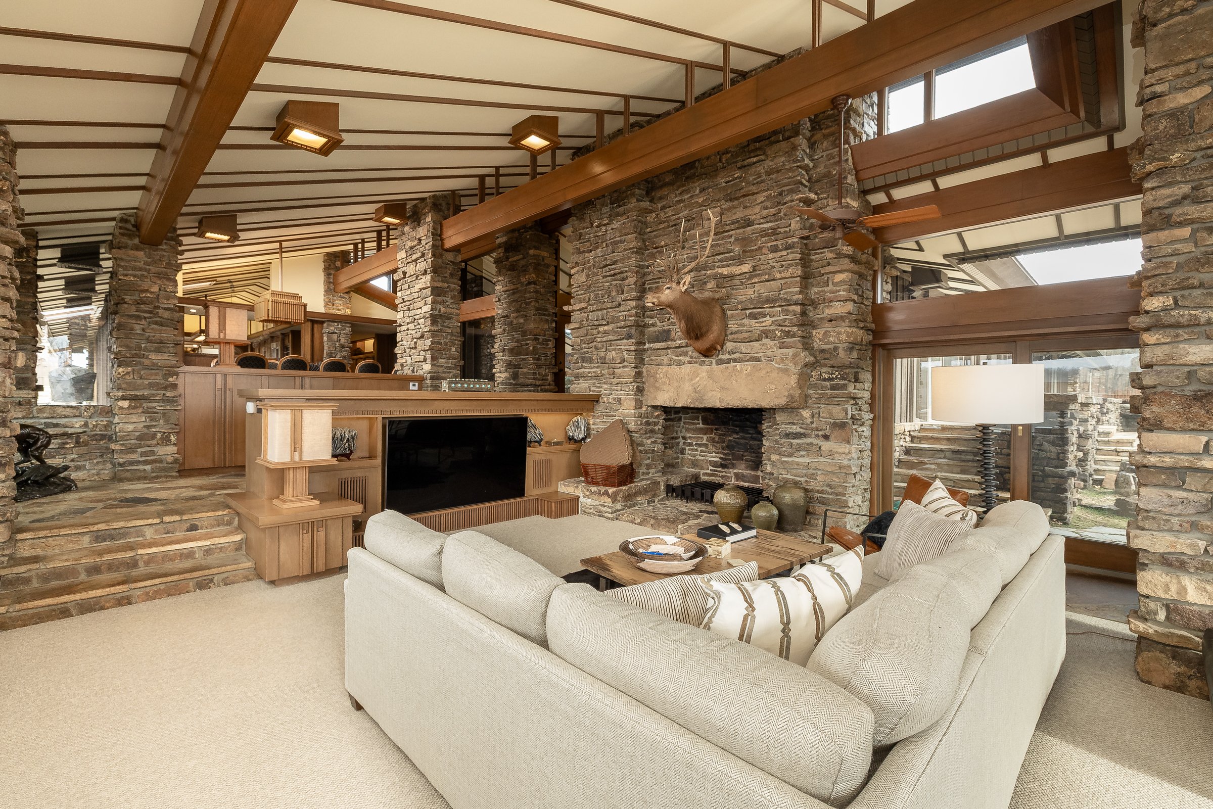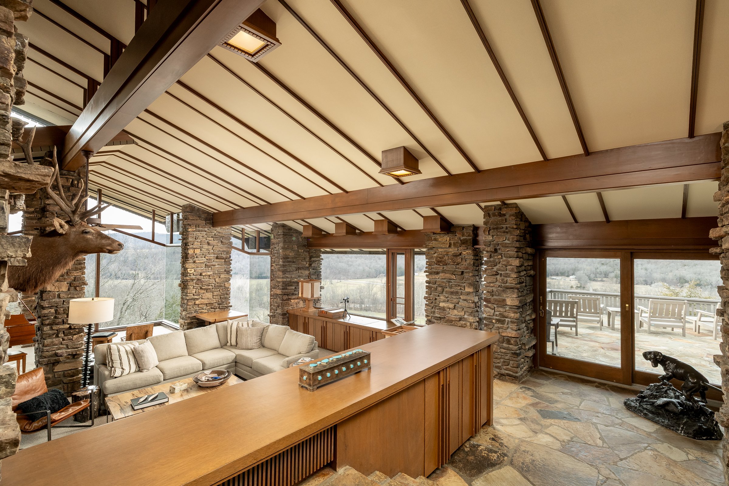 Architecturally significant and fully designed by acclaimed architect Fay Jones, this extraordinary estate offers a rare opportunity to own a true work of art. Completed in 1976, the 6,333-square-foot stone and cedar residence reflects Jones’s signature organic architecture, where natural materials, vaulted ceilings with exposed beams, extensive flagstone floors, skylights, and dramatic walls of glass create a seamless connection between interior spaces and the surrounding landscape. Four massive stone fireplaces, custom wood lighting, built-ins, and carefully crafted architectural details add warmth and character throughout the home.